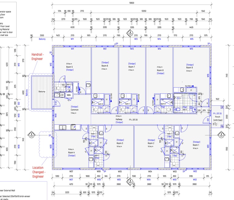 Safety is equally critical. A rooming house is shared by people who may not know each other, so the design must support safe movement and behaviour throughout the building. Corridors, compliant egress paths, fire-safety measures, and emergency lighting all form part of this consideration.